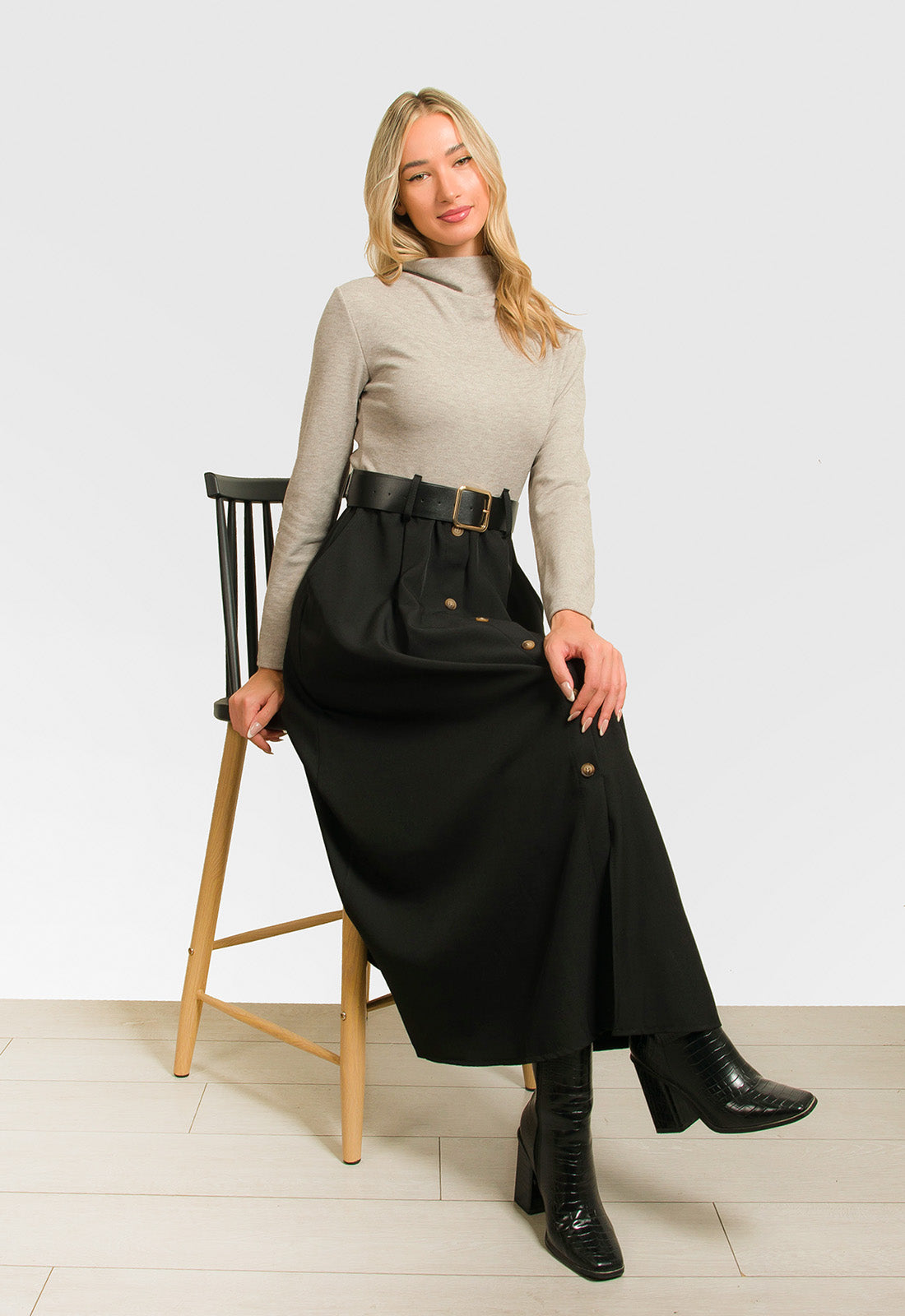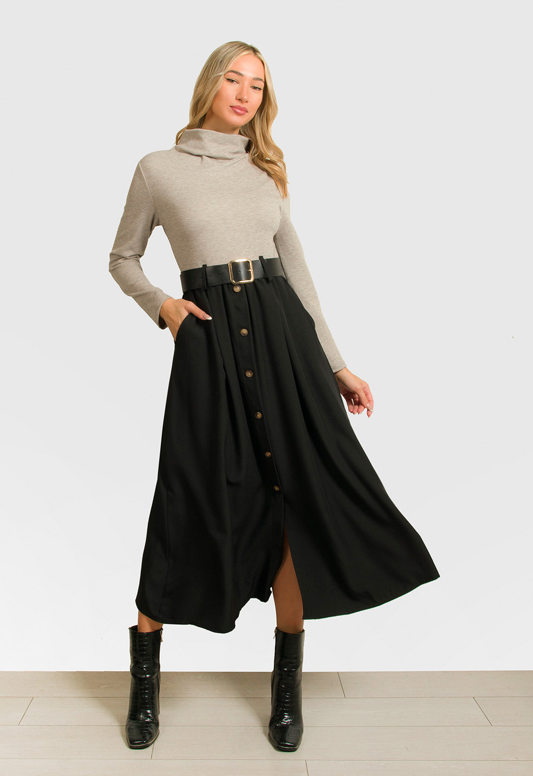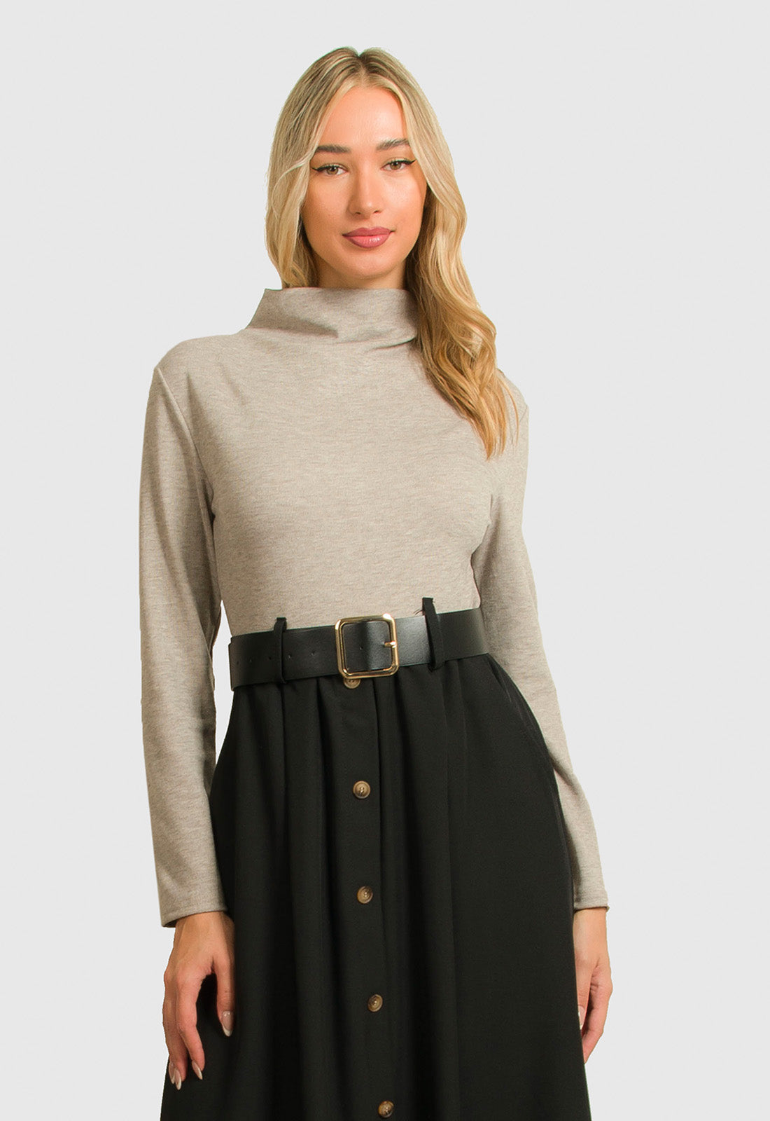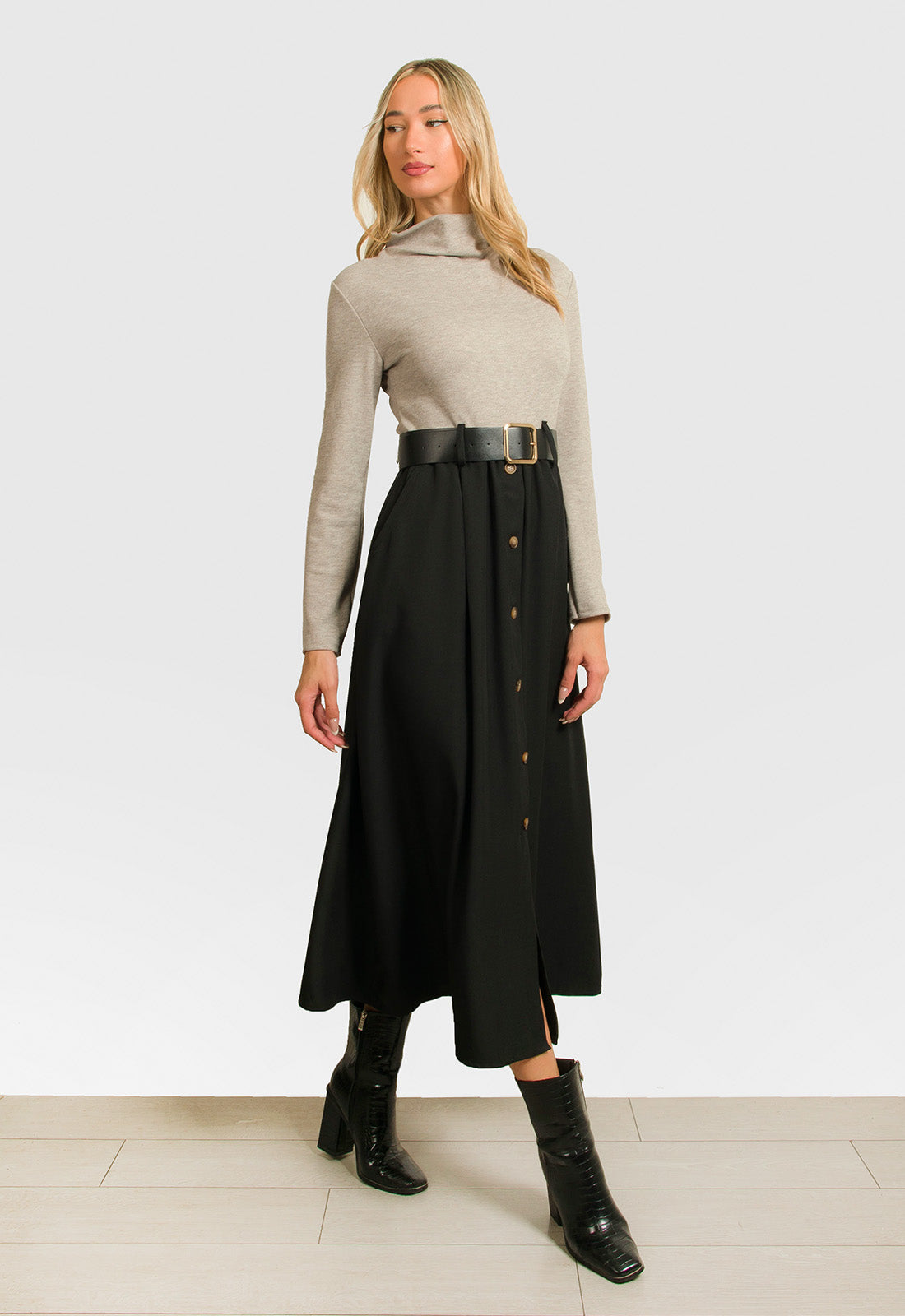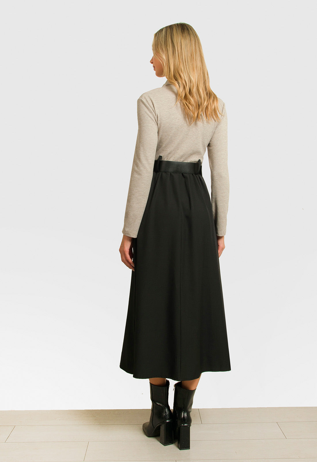 -Φόρεμα κομποζέ με πλεκτό μπεζ ύφασμα στο πάνω μέρος και σταθερό μαύρο στο κάτω
