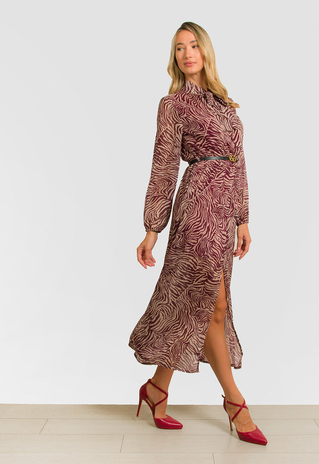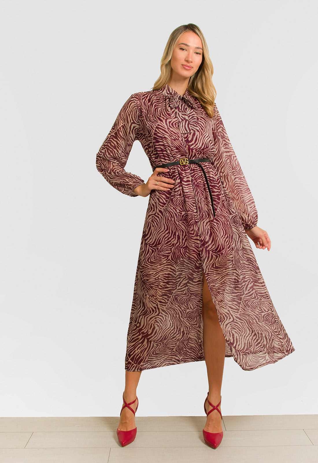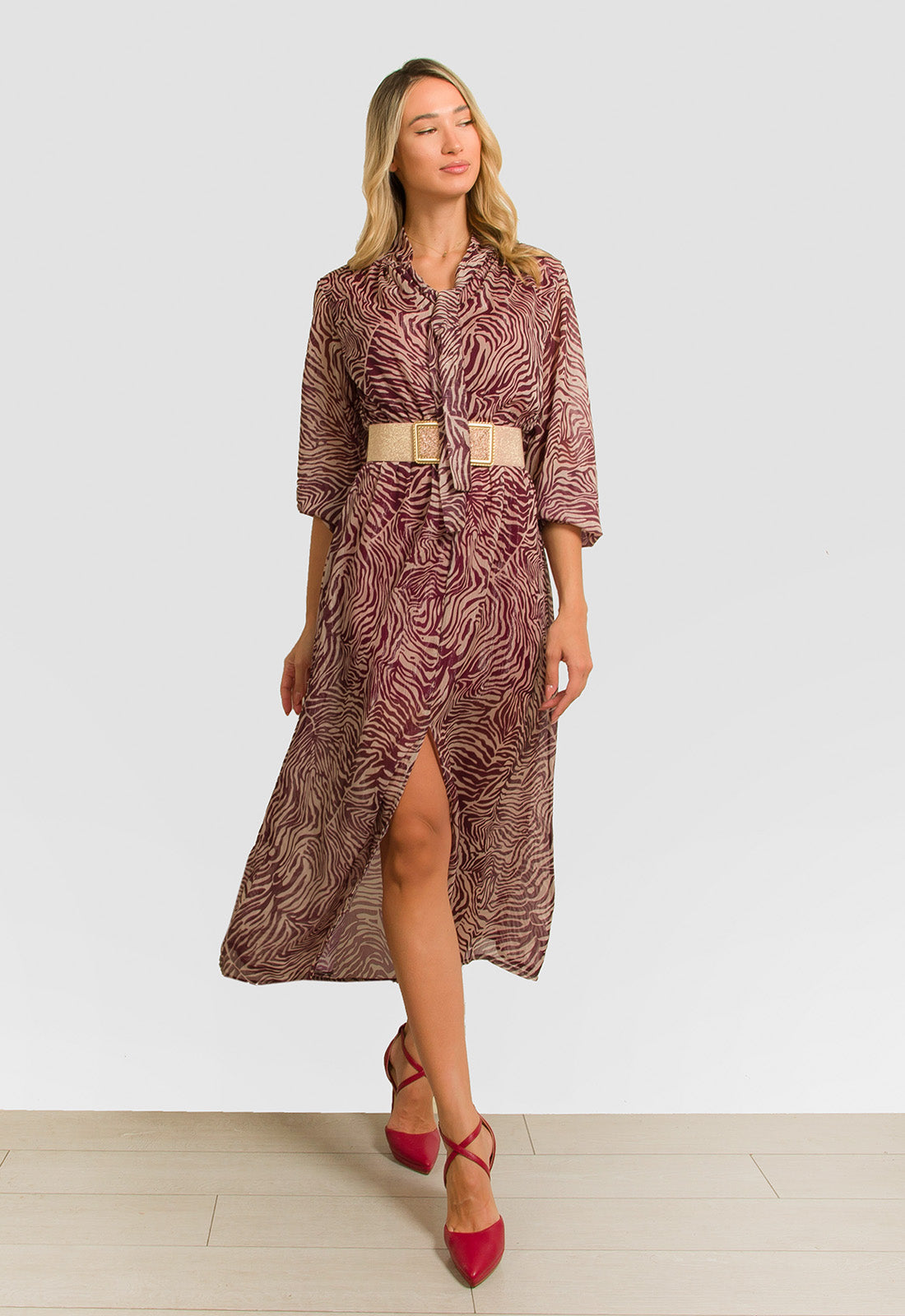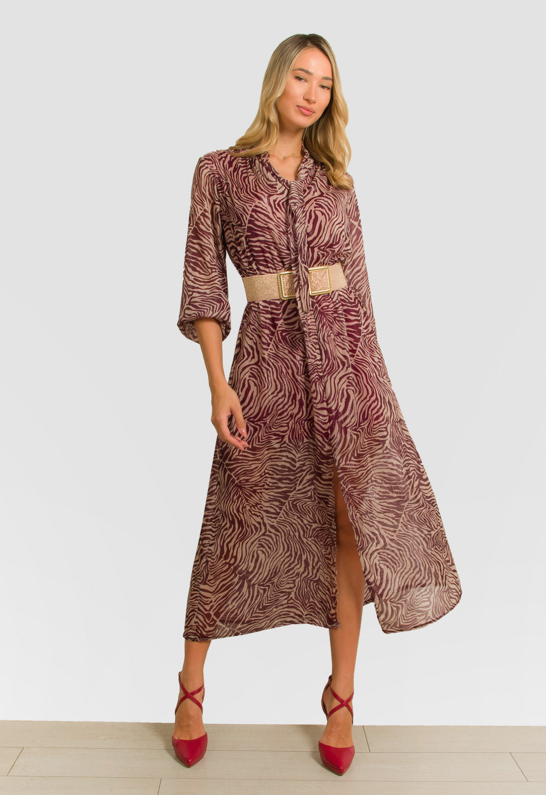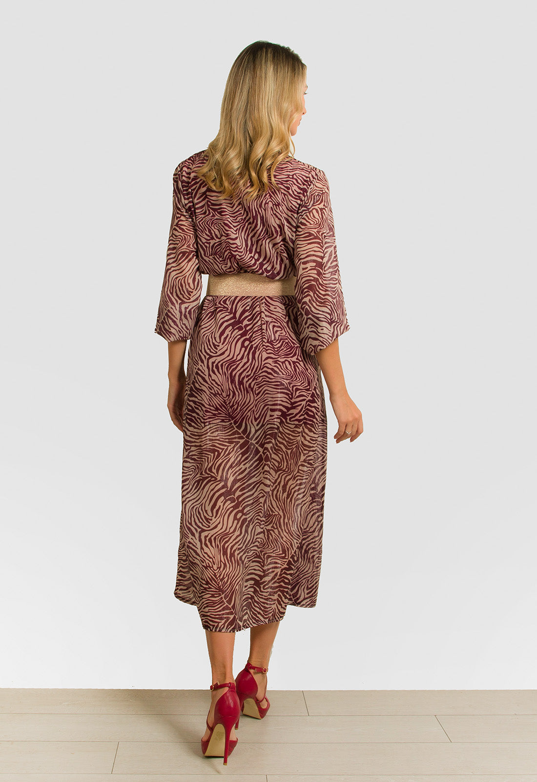 -Φόρεμα midi σε σταθερό ύφασμα εμπριμέ ζορζέτα με ασημοκλωστή